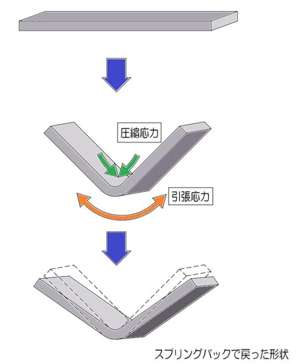 これは曲げた部分がバネの様に少し元に戻る現象のことで、全長にわたって発生します。ベンダー曲げでのスプリングバックは、力を加えたとき板の内部で、曲げの内側には圧縮の力が、曲げの外側には引っ張りの力が働き、力を除くと圧縮と引っ張りの反力でバネの様に板が少し元に戻る現象のことです。あらかじめこの戻り量を計算して深めに曲げたりと言った対策が取られます。